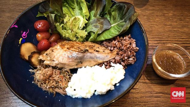 Cukup lama menanti, sekitar 20 menit, mangkuk Petite pun tiba di hadapan. Nasi merah dengan 100 kalori itu dibuat dengan cukup kering. Sedangkan daging salmon terasa lembut dan segar.